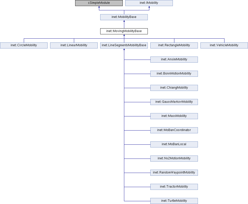 Implemented in inet::Ns2MotionMobility, inet::TurtleMobility, inet::CircleMobility, inet::MassMobility, inet::AnsimMobility, inet::BonnMotionMobility, inet::RectangleMobility, inet::VehicleMobility, inet::GaussMarkovMobility, inet::ChiangMobility, inet::RandomWaypointMobility, inet::LinearMobility, and inet::LineSegmentsMobilityBase.