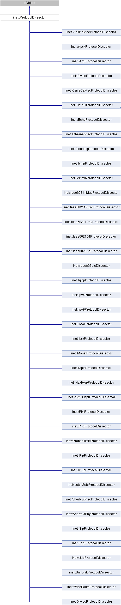 Implemented in inet::DefaultProtocolDissector, inet::Ieee80211MacProtocolDissector, inet::physicallayer::GptpProtocolDissector, inet::physicallayer::Ieee8021qTagEpdProtocolDissector, inet::physicallayer::Ieee8021rTagEpdProtocolDissector, inet::physicallayer::EthernetPhyProtocolDissector, inet::ospf::OspfProtocolDissector, inet::sctp::SctpProtocolDissector, inet::AckingMacProtocolDissector, inet::BMacProtocolDissector, inet::CsmaCaMacProtocolDissector, inet::EthernetMacProtocolDissector, inet::Ieee80211MgmtProtocolDissector, inet::Ieee802154ProtocolDissector, inet::StpProtocolDissector, inet::Ieee802LlcDissector, inet::LMacProtocolDissector, inet::PppProtocolDissector, inet::ShortcutMacProtocolDissector, inet::XMacProtocolDissector, inet::ArpProtocolDissector, inet::EchoProtocolDissector, inet::FloodingProtocolDissector, inet::Icmpv6ProtocolDissector, inet::IcmpProtocolDissector, inet::IgmpProtocolDissector, inet::Ipv4ProtocolDissector, inet::Ipv6ProtocolDissector, inet::MplsProtocolDissector, inet::NextHopProtocolDissector, inet::ProbabilisticProtocolDissector, inet::RsvpProtocolDissector, inet::LsrProtocolDissector, inet::WiseRouteProtocolDissector, inet::ApskProtocolDissector, inet::Ieee80211PhyProtocolDissector, inet::ShortcutPhyProtocolDissector, inet::UnitDiskProtocolDissector, inet::ManetProtocolDissector, inet::PimProtocolDissector, inet::RipProtocolDissector, inet::TcpProtocolDissector, inet::UdpProtocolDissector, and inet::Ieee802EpdProtocolDissector.