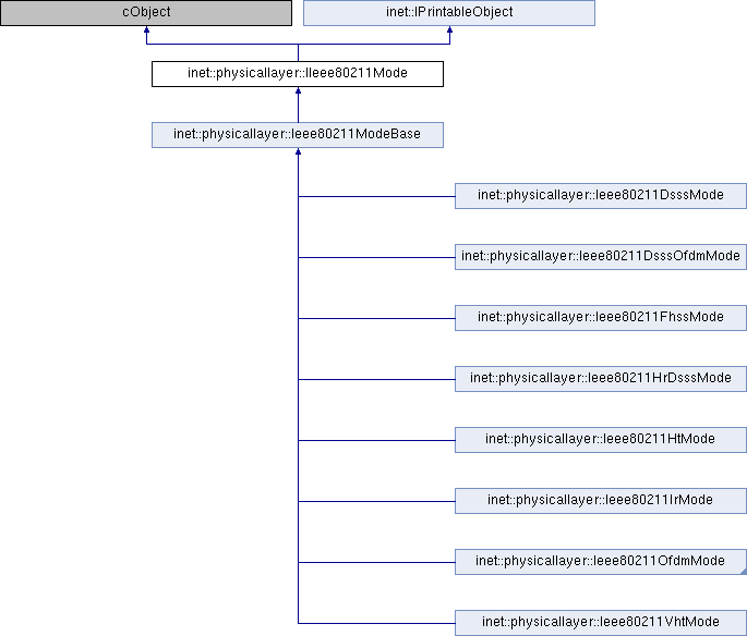 Implemented in inet::physicallayer::Ieee80211HtMode, inet::physicallayer::Ieee80211OfdmMode, inet::physicallayer::Ieee80211HrDsssMode, inet::physicallayer::Ieee80211DsssMode, inet::physicallayer::Ieee80211IrMode, inet::physicallayer::Ieee80211FhssMode, inet::physicallayer::Ieee80211DsssOfdmMode, inet::physicallayer::Ieee80211ErpOfdmMode, and inet::physicallayer::Ieee80211VhtMode.
