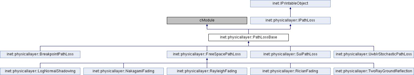 Implemented in inet::physicallayer::UwbIrStochasticPathLoss, inet::physicallayer::SuiPathLoss, inet::physicallayer::FreeSpacePathLoss, inet::physicallayer::RicianFading, inet::physicallayer::NakagamiFading, inet::physicallayer::RayleighFading, inet::physicallayer::LogNormalShadowing, and inet::physicallayer::BreakpointPathLoss.