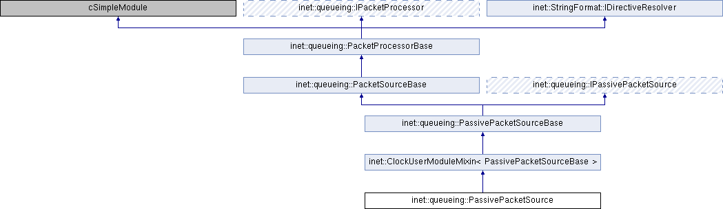 Public Member Functions inherited from inet::ClockUserModuleMixin< PassivePacketSourceBase > | |