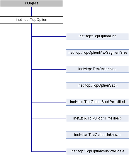 Reimplemented in inet::tcp::TcpOptionUnknown, inet::tcp::TcpOptionTimestamp, inet::tcp::TcpOptionSack, inet::tcp::TcpOptionSackPermitted, inet::tcp::TcpOptionWindowScale, inet::tcp::TcpOptionMaxSegmentSize, inet::tcp::TcpOptionNop, and inet::tcp::TcpOptionEnd.